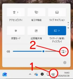 ここが録音を成功させる一番のポイントです!パソコンの音声がそのままラジカセに流れるよう、PCの画面右下からスピーカーの「出力先」を切り替える設定を行います。