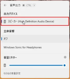 PC側の操作でデスクトップ右下にあるスピーカーのアイコンをクリックしスピーカーを選択します。