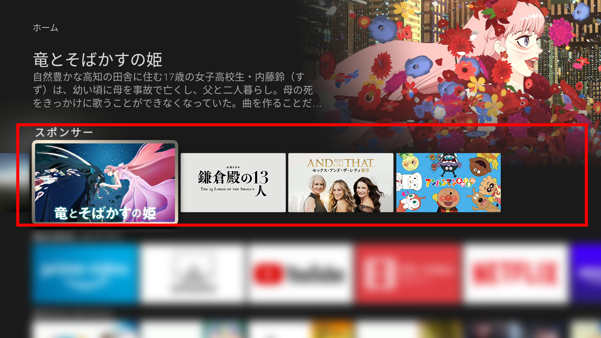 ・ホーム画面から作品を探す場合は、Amazonプライムビデオ外のサービス(NetFlix,Hule)等も表示されます。