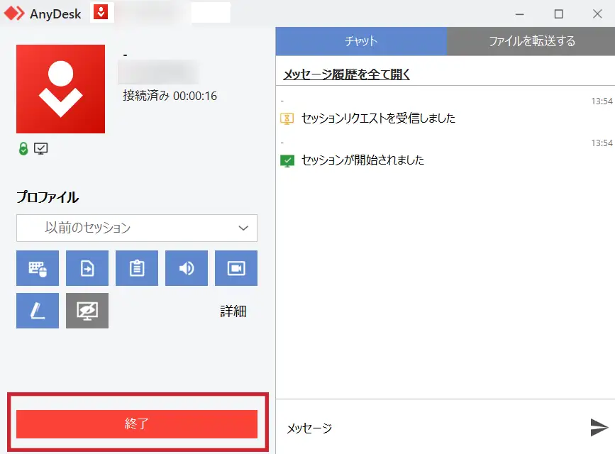 接続が終わった際や、途中で接続を切りたくなった場合は、AnyDeskウィンドウの下部にある**「終了」**ボタンを押すだけで、いつでも即座に通信を遮断できます。
