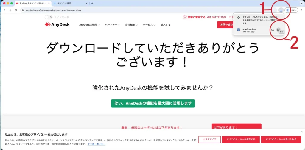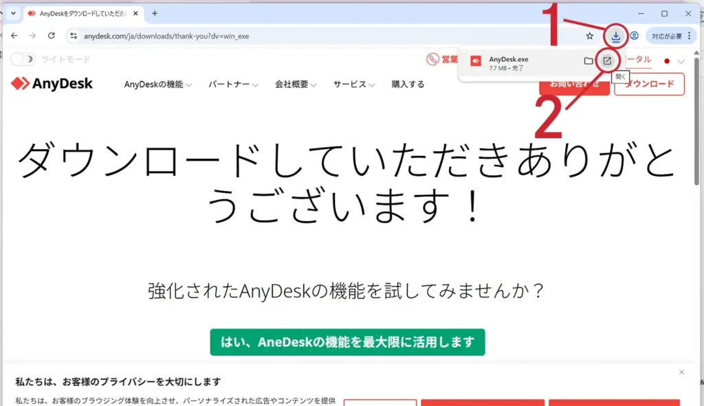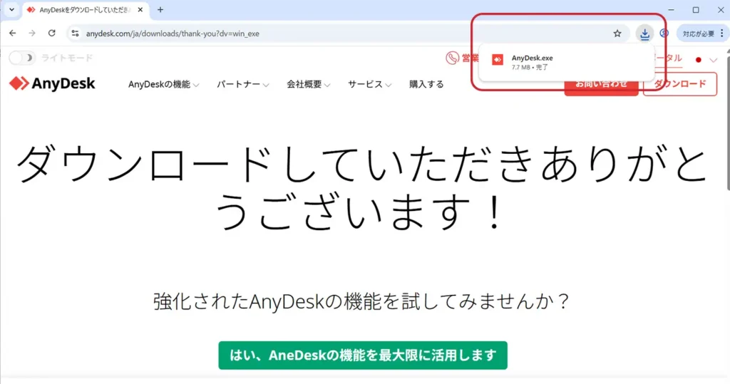 ダウンロード先は上記リンクボタンをクリックすると、AnyDeskのダウンロードページが表示されます。