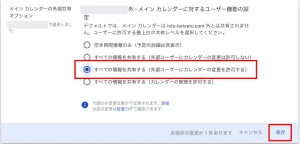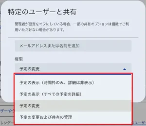 すべての情報を共有する(カレンダーの管理を許可する)をオンにすると外部ユーザーが勝手に他のアカウントを追加する事もできてしまうので注意。